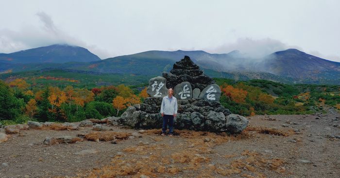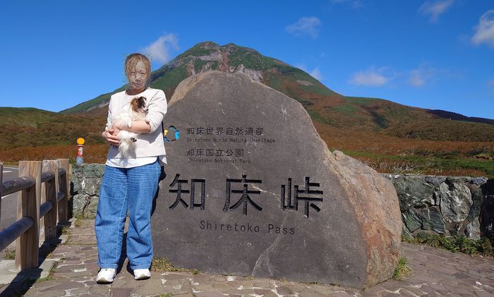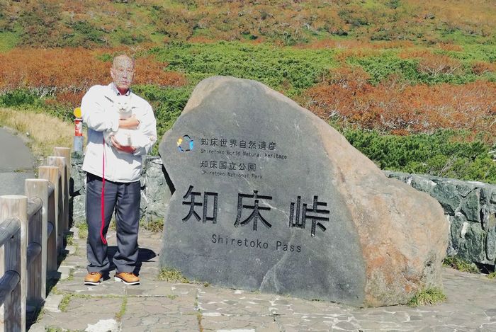 知床峠で、記念写真。後ろは羅臼岳だと思います。