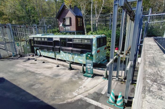 途中降りて、高架台を歩くのですがバスは檻のなかで止まって、ヒグマが入れない