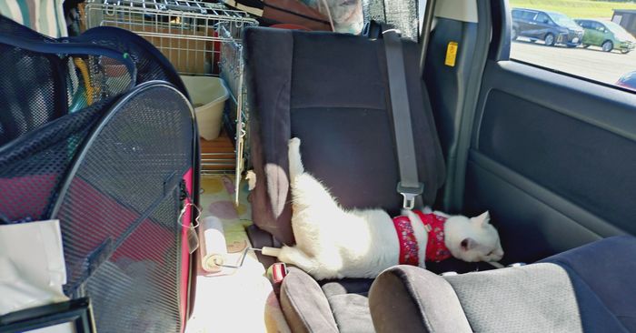 車の中での「たみ」の姿です。結構リラックスしています。